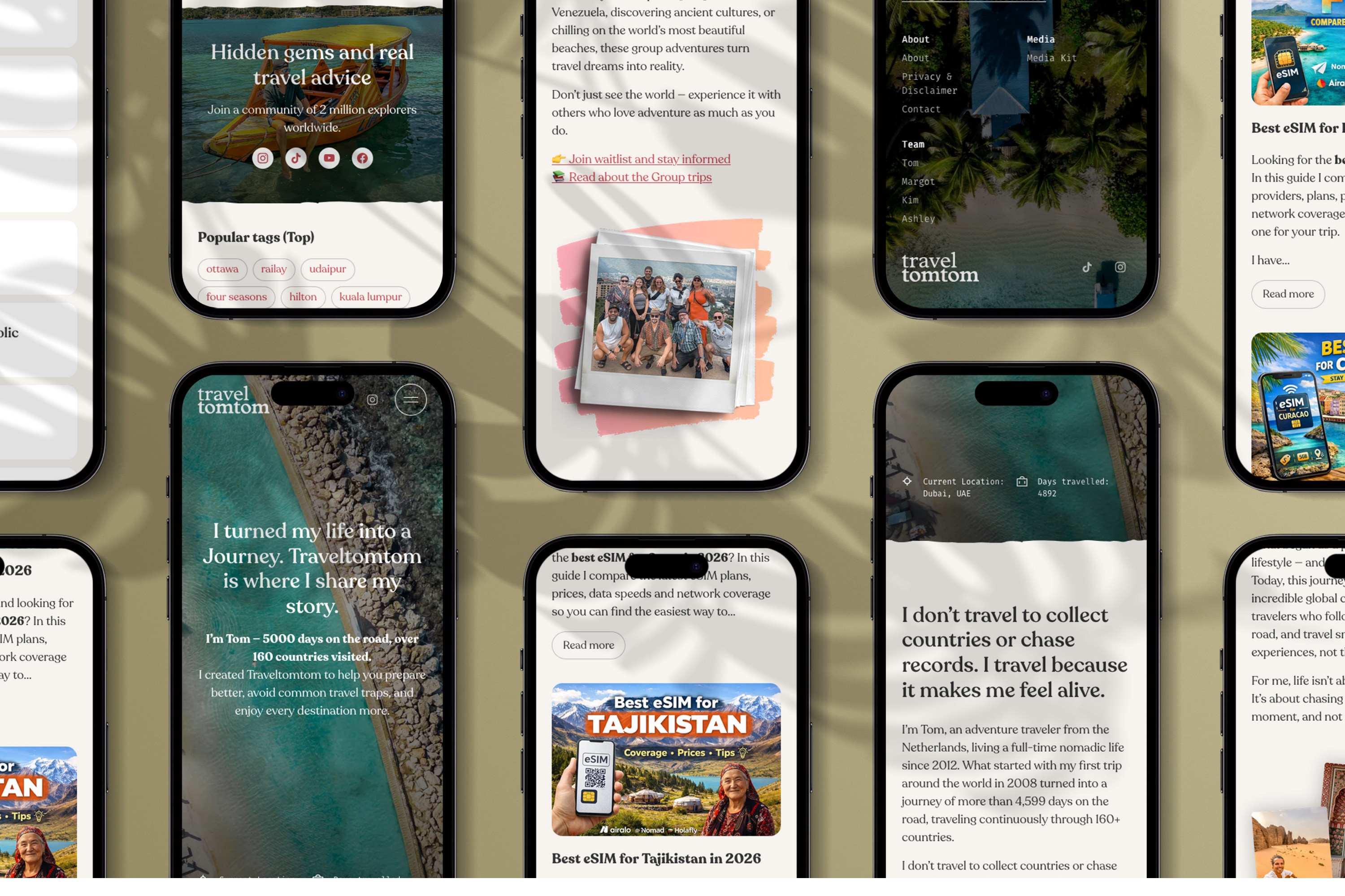 Traveltomtom ist das digitale Zuhause von Tom Grond – einem Reisenden, der seit über 5.000 Tagen die Welt erkundet und seine Erfahrungen aus erster Hand teilt. Was als persönliches Hobby begann, hat sich über die Jahre zu einem profitablen Online-Business entwickelt. Die Website ist eine umfangreiche Sammlung aus Reiseberichten, Länder-Guides und praktischen Tipps mit einem starken Fokus auf eSim-Reviews, die monatlich von einer großen, internationalen Leserschaft genutzt wird.