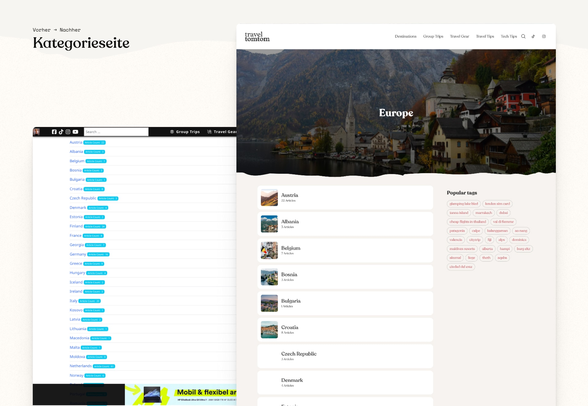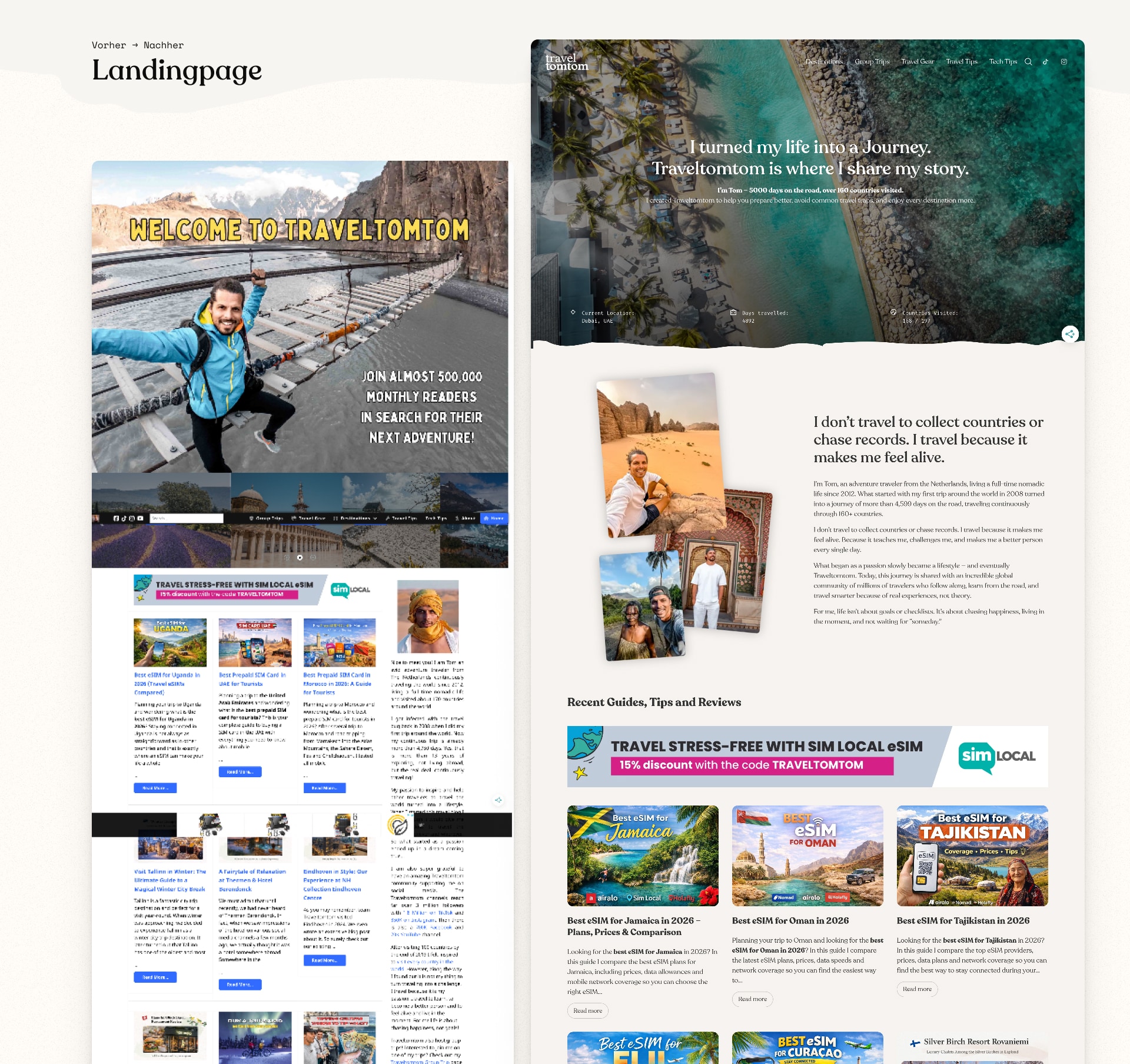 Das alte Design war funktional, ließ aber wenig von der Persönlichkeit und dem Abenteuergeist durchscheinen, die Toms Reisen ausmachen. Für die Zielgruppe – Menschen, die authentische Reiseinformationen suchen – ist genau das entscheidend: Sie wollen wissen, dass die Tipps von jemandem kommen, der wirklich vor Ort war, und nicht von einer gesichtslosen Affiliate-Seite.
